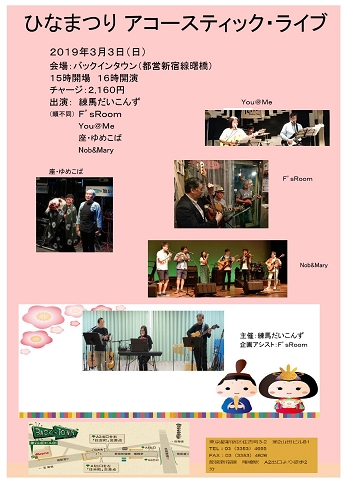 ★★★ 出演バンド ★★★ ●1部 16:05~16:30 You@Me 16:35~17:00 Nob & Mary 17:05~17:30 座・ゆめこば(休憩:20分)17:30~17:50 ●2部 17:50~18:20 F’S Room 18:25~19:05 練馬だいこんず