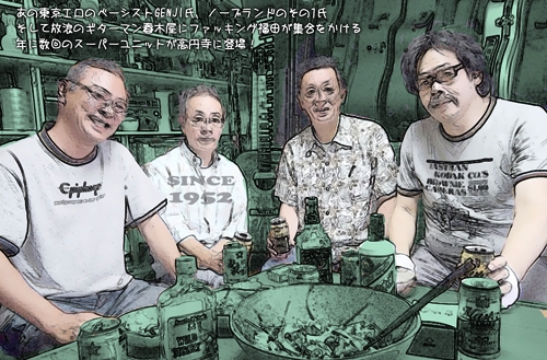 F's ROOMF!、Genji、春木屋、その1の4人組ユニット。F!以外の3人は、それぞれ別のバンドで活動をしているが、F!がライブをやる時に、この3人が集まり「F’s ROOM」で演奏。ちょっと変なおじさん4人組です、よろしく!
